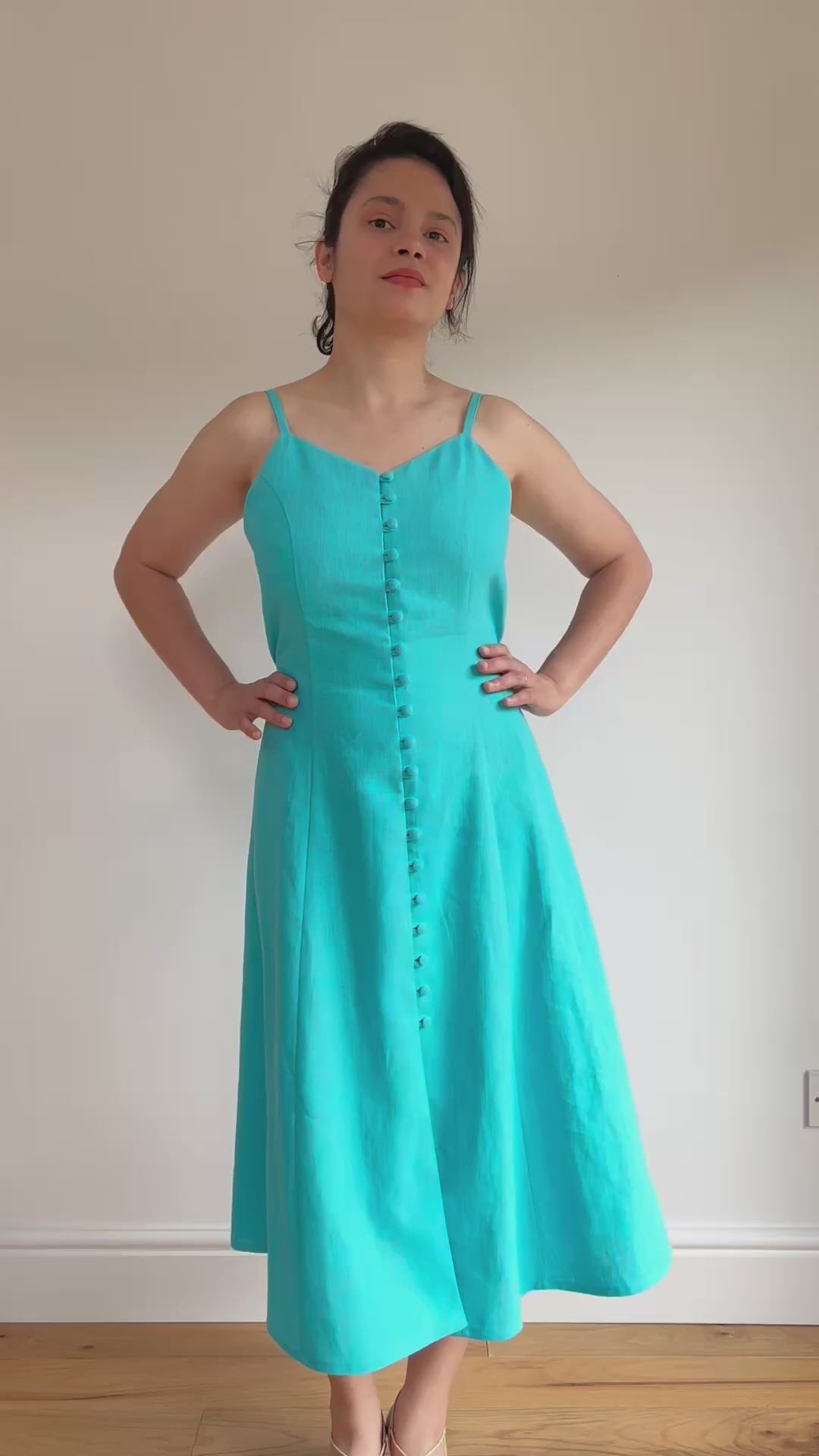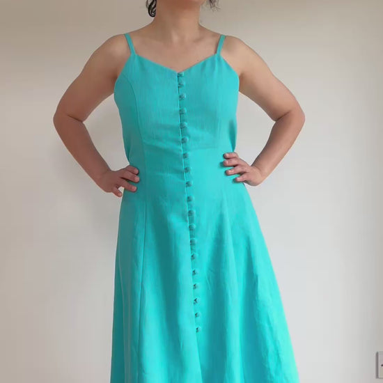 Izolda is a midi-length sundress with princess seams on the front and back. It features spaghetti straps, a “V” front neckline and a button closure with rouleau button loops on the centre front.